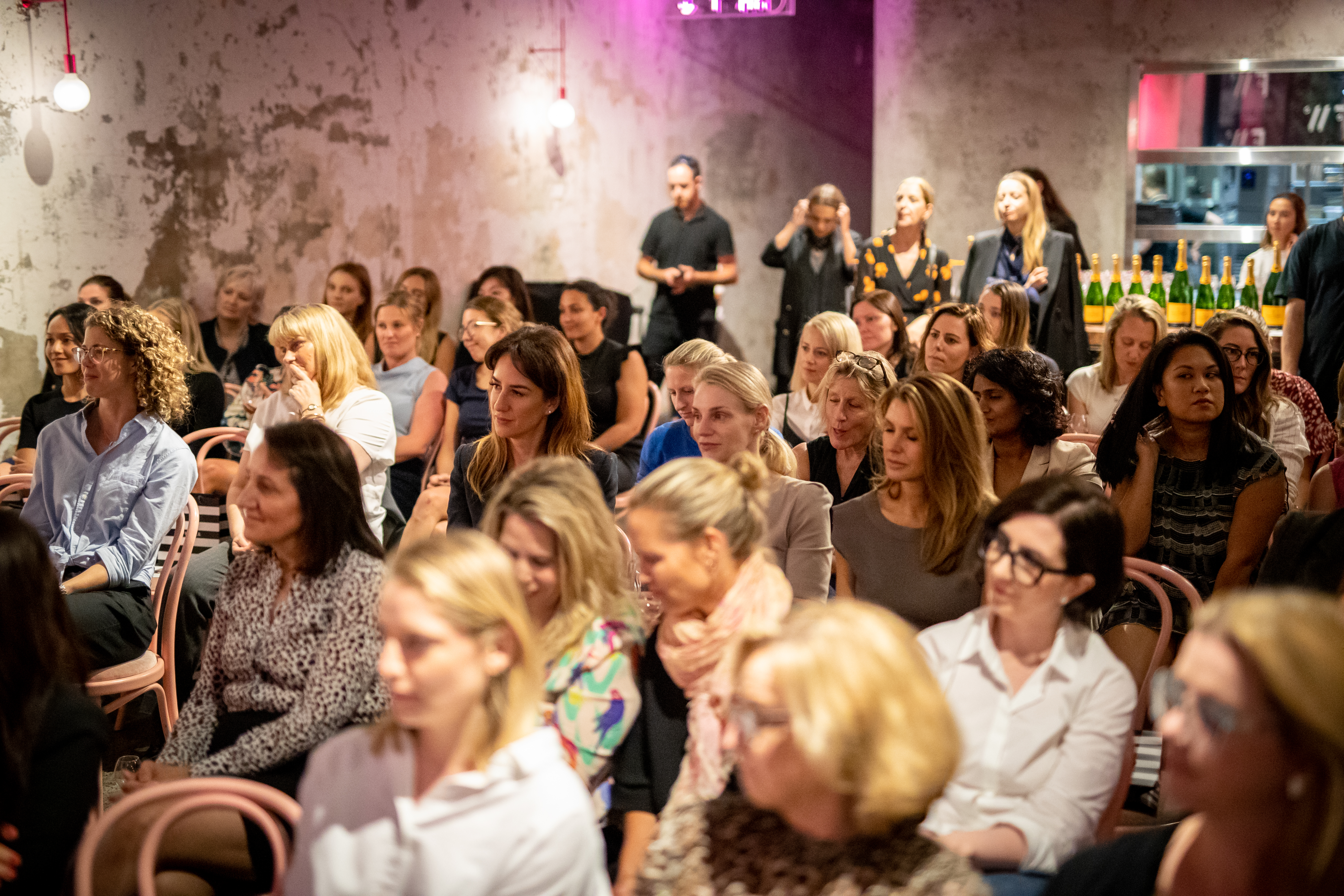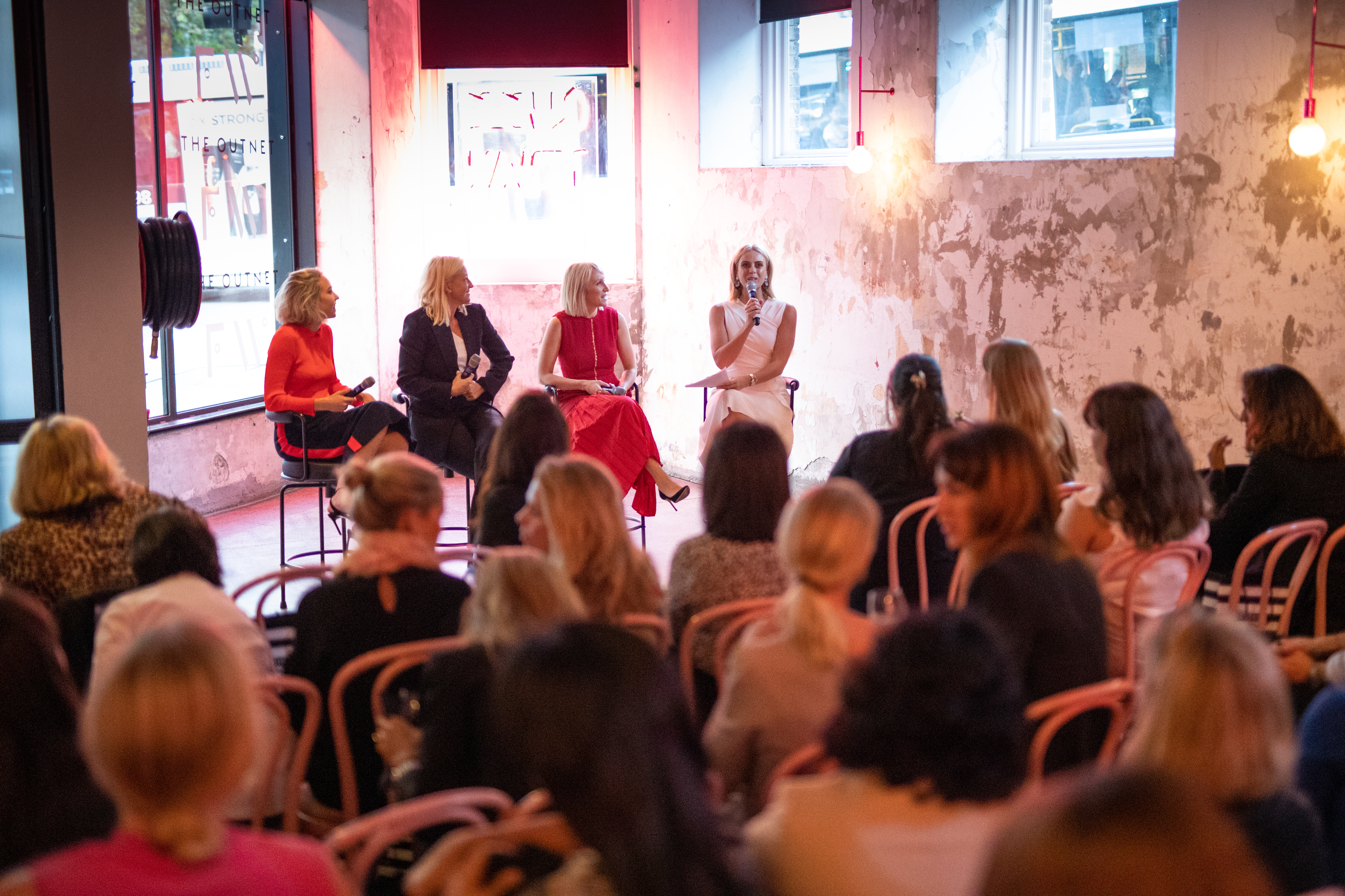 60 guests descended on the sleek grey concrete space with pink neon signs in Surry Hills for an evening of fashion, style and thoughtful conversation.