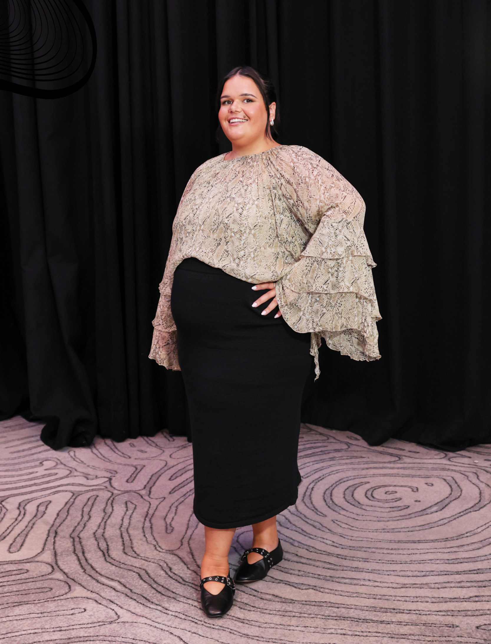 Gabrielle wears Witchery Ruffle ShirtKnit Maxi SkirtKelsey Buckle Flats and Sofia Huggie.