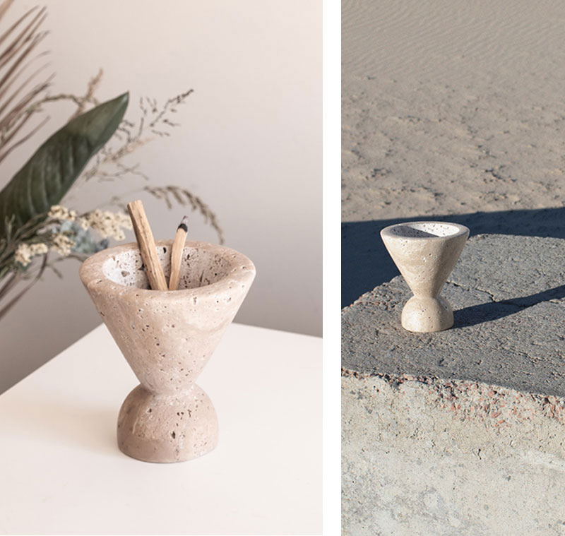 Carved from solid beige travertine, the Neue Void incense burner is sculptural and functional with a large funnel design that functions as an ash catcher. Its beautiful design means it doubles as an art piece when not in use. Each burner comes with Palo Santo and is suitable for all types of incense.