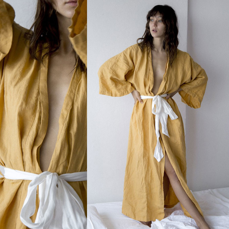 Nothing says self-care like jumping out of the shower and wrapping yourself in a fresh robe. Made from stone-washed French linen, Deiji’s full length Japanese-inspired kimono robes are made for ultimate comfort with a white linen waist tie, extra-wide sleeves and low hidden pockets.