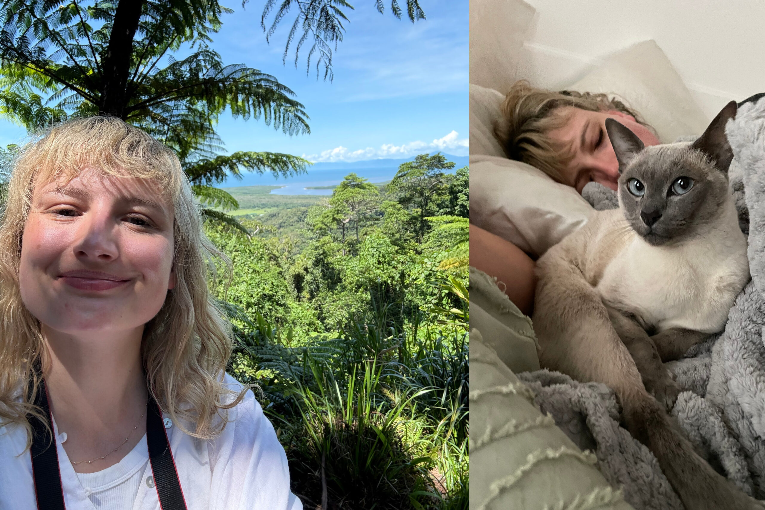 Left: Sally Spicer on a tour of the Daintree Rainforest. Right: Sally Spicer with her cat Nina.